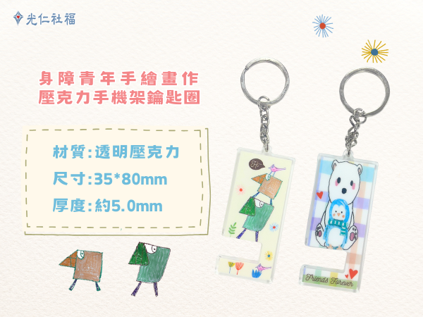 ★捐款滿350元 | 索取「身障青年畫作壓克力手機架鑰匙圈」乙個。