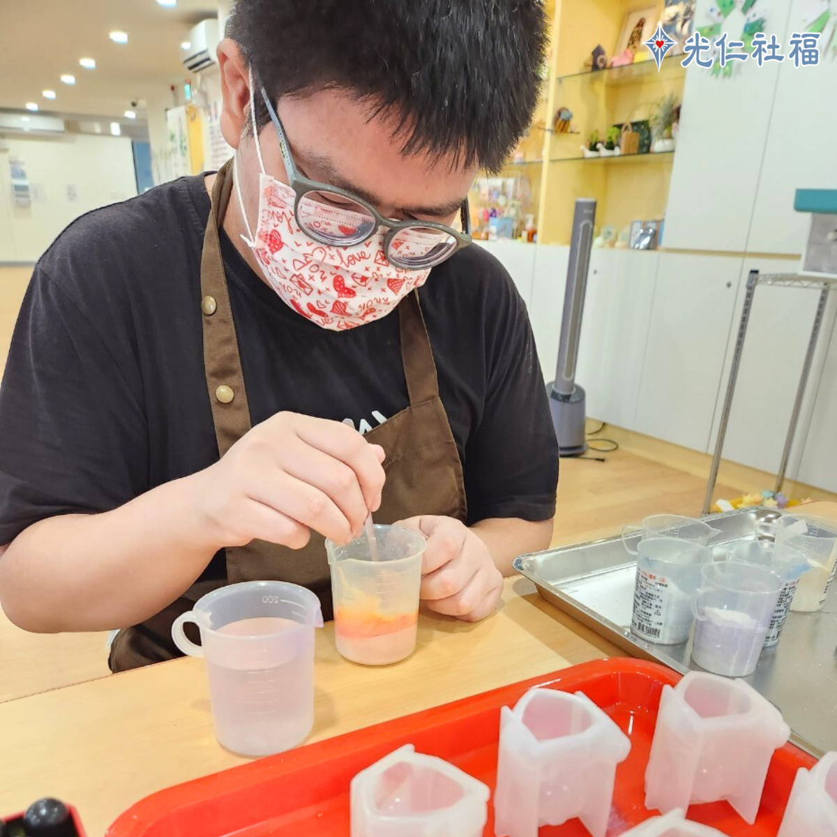 113年輾轉來到北大學勤小作所,進行作業活動的加強及自立生活訓練,每天非常積極的學習。在香氛手作的課程裡,我們發現阿吉對於美感很有敏銳度,並在擴香石文創商品開發時,讓阿吉自己動手做,調製各種色系的顏色。阿吉每天都很期待作品的呈現,也漸漸變得有自信,擴香石的創作不僅能幫助心智障礙者的手作訓練,更能帶領他們創造出自己的一片天地。
